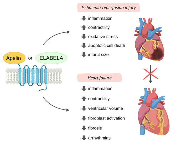 In recent years, apelin and ELA have emerged as potential therapeutic tools for myocardial I/R injury limitation, as they have been shown to exert protective effects against various pathological processes associated to this condition (Figure 4).