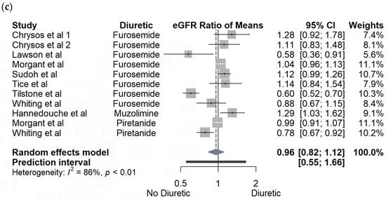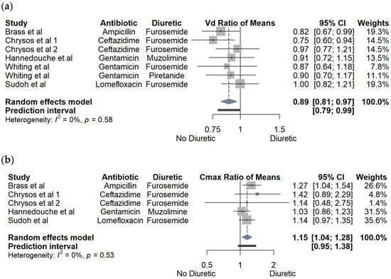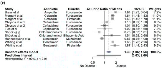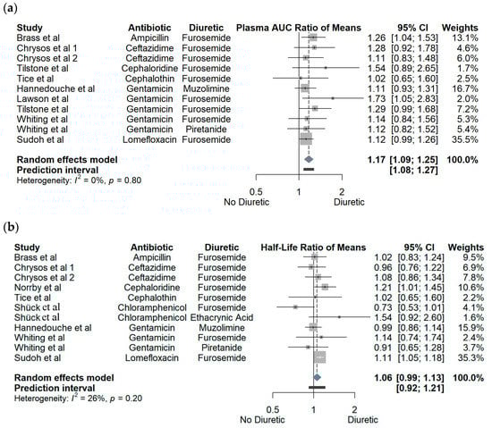 Pooled effect estimates of loop diuretics on PK parameters AUC, T1/2, Vd, Cmax, Ae, and eGFR are summarized in Figure 1a–c and Figure 2a–c. Subgroup analysis by antibiotic category or by type of loop diuretic did not reveal any statistically significant or clinically relevant differences. Findings of subgroup analyses are summarized in Tables S1 and S2 in the Supplementary Materials. Presence of a loop diuretic was associated with an overall 17% (2–54%) increase in plasma AUC. The direction of all effect estimates for AUC was homogeneous, regardless of antibiotic or loop diuretic. Although only two studies individually achieved statistical significance, the overall mean effect was statistically significant with a confidence interval of 9–25% increase in plasma AUC. Similarly, the presence of a loop diuretic was associated with an overall statistically significant mean decrease of 11% for Vd, with 0% heterogeneity; however, again, only two individual studies achieved statistical significance. Half-life was largely unchanged in the presence of a loop diuretic, with no study demonstrating a significant effect, and with a mean non-statistically significant 6% increase. Given that AUC increased and Vd decreased in similar proportions, the finding of a nearly unchanged half-life is expected as T1/2 is mathematically determined by the ratio of CL and Vd, and CL is inversely proportional to AUC (see Equations (1) and (2)). An observed overall mean increase of 15% in Cmax was consistent with the observed decrease in Vd, as Cmax and Vd are inversely proportional (see Equation (3)). Presence of a loop diuretic was associated with a statistically significant 30% increase in Ae; however, heterogeneity was 90%, with a large prediction interval crossing one. There were insufficient data for subgroup analysis; however, there was no obvious trend suggesting that an antibiotic class or specific diuretic would explain the heterogeneity. Generally, presence of a loop diuretic was associated with a minimal effect on eGFR, i.e., an overall nonsignificant mean effect of a 4% reduction. However, Lawson et al. [21] and Tilstone et al. [16] demonstrated remarkably large mean eGFR reductions of 42% and 40%, respectively, associated with the presence of a loop diuretic.