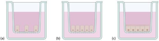 Schematic representation of Caco-2 cells grown on a Transwell® insert. Cells were represented (a) at the beginning of the culture, (b), once confluent, and (c) structurally and functionally differentiated in mature enterocytes after 21 days. Created with Biorender.com (accessed on 17 January 2023).