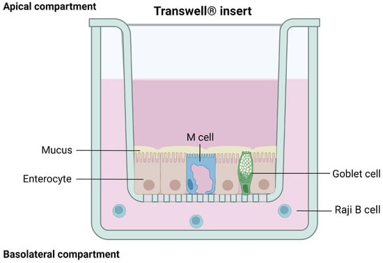 Schematic representation of a well-differentiated Caco-2/HT-29/Raji B cells model. Created with Biorender.com (accessed on 12 February 2023).