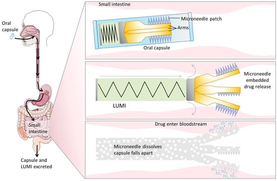 - Prausnitz, M.R.; Gomaa, Y.; Li, W. Microneedle patch drug delivery in the gut. Nat. Med. 2019, 25, 1471–1472. [Google Scholar] [CrossRef]