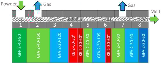 - Kohlgrüber, K.; Bierdel, M. Co-Rotating Twin-Screw Extruders: Fundamentals, Technology, and Applications; Carl Hanser Publishers: Cincinnati, OH, USA; Hanser Gardner Publications: Munich, Germany, 2008; Volume 13, p. 354. [Google Scholar]