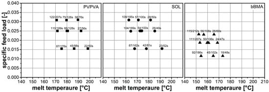 | Polymer | [1/min] | [kg/h] | [°C] | [MPa] | [1/s] | [s] | [s] |