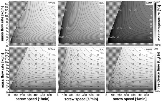 - Gottschalk, T.; Grönniger, B.; Ludwig, E.; Wolbert, F.; Feuerbach, T.; Sadowski, G.; Thobmmes, M. Influence of process temperature and residence time on the manufacturing of amorphous solid dispersions in hot melt extrusion. Pharm. Dev. Technol. 2022, 27, 313–318. [Google Scholar] [CrossRef] [PubMed]