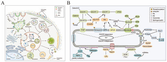 Overview of the process for sEV biogenesis (A) and multiple mechanisms (B); Copyright 2022, Springer Nature [32].