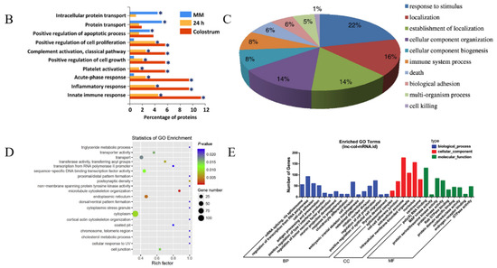 Composition and functions of msEVs. (A) Schematic of the composition of msEVs (by Figdraw, www.figdraw.com (accessed on 10 April 2023)) (B) Functional enrichment analysis using FunRich revealed msEVs from colostrum are enriched with proteins implicated in immune response. * p < 0.05; Copyright 2017, Springer Nature [48]. (C) GO annotation for msEV proteins in biological processes; Copyright 2017, Elsevier [77]. (D) The 20 most enriched GO terms for the circular RNA host gene; Copyright 2019, Elsevier [78]. (E) Gene ontology (GO) annotation analysis of bovine msEV long noncoding RNA (lncRNA); Copyright 2019, Elsevier [79].