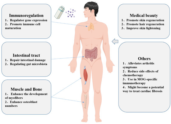sEVs from milk taken orally reduce the signs and symptoms of arthritis in IL-1 Ra-deficient spontaneous polyarthritis mice and arthritis animal models generated by collagen [135]. In response to chemotherapeutic side effects, msEVs protect macrophages from cisplatin-induced cytotoxicity [136]. A protein known as butyryl protein (BTN), which shares an epitope with the myelin oligodendrocyte glycoprotein (MOG), was identified in milk, and transdermal administration of msEVs to patients with multiple sclerosis induced the development of MOG-specific tolerance for use in MOG-specific immunotherapy [137]. MsEVs can be an effective medicinal ingredient to improve skin lightening. MiR-2478 insEVs inhibits melanogenesis by the Akt-GSK3β signal pathway and is able to reduce melanin content, tyrosinase activity, and melanogenesis-related gene expression in melanoma cells and melanocytes [138]. The use of msEVs might become a potential way to treat cardiac fibrosis. MsEVs attenuate the effects of cardiac fibrosis by enhancing angiogenesis and improving cardiac function in rats with cardiac fibrosis [139]. Colostrum-derived sEVs have the potential to promote hair regeneration. It was reported that colostrum sEVs could promote dermal papillary cell (DP) cell proliferation, rescue dihydrotestosterone (DHT)-induced follicular development arrest, and induce dorsal hair regrowth in mice at levels similar to minoxidil therapies without related side effects, such as rash [140].