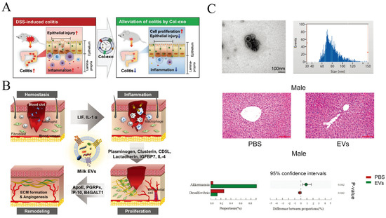 The function of intestinal epithelial cells can also be impaired by other damaging factors, such as lipopolysaccharides. TLR4, which contributes to the occurrence of intestinal inflammation and necrotizing enterocolitis (NEC), can be inhibited by msEVs [112]. In a mouse genetically engineered to have ulcerative colitis, msEVs could prevent severe ulcerative phenotypes and intestinal inflammation [113]. Oral administration of msEVs can prevent NEC as approved by reducing morphological damage and injury to the ileum and reducing the number of MUC2+ and GRP94+ cells [114]. MsEVs enhanced the activity of gastric goblet cells and prevented experimental necrotizing small bowel colitis [115]. MsEVs can prevent dextran sulfate sodium-induced enterocolitis by inhibiting inflammation and oxidative stress, especially in colostrum-derived msEVs [116], as shown in Figure 5A. MsEVs altered the characteristic cuboidal form of normal colonic epithelial cells into a mesenchymal-like morphology and induced proliferation, which had not been seen in tumor cells [117]. The mechanism was attributed to the fact that msEVs up-regulated type I collagen expression and down-regulated Twist1 gene expression and PTEN proteins. sEVs derived from yak milk attenuate LPS-induced intestinal inflammation by suppressing activation of the PI3K/AKT/C3 signal pathway [118]. Severe acute malnutrition (SAM) is usually caused by epithelial atrophy and intestinal barrier disruption, and sEVs isolated from milk ameliorate malnutrition-induced intestinal barrier dysfunction [119].