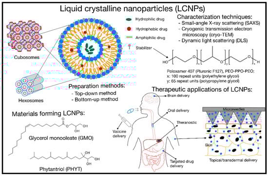 The first part of this review mainly provides a brief overview of commonly studied lipids forming non-lamellar mesophases, preparation methods for LCNPs, as well as the use of stabilizers in stabilizing LCNPs. Next, we summarize the various characterization techniques to evaluate the potential of LCNPs in drug delivery systems. Lastly, we highlight selected therapeutic applications such as oral, topical, vaccine, targeted, theranostics, and brain drug delivery. The summary is sketched in Figure 1 and examples of therapeutics applications are presented Table 1.
