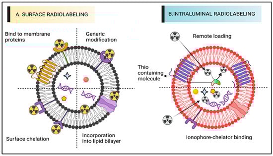For SPECT and PET applications, ECVs have been labelled with a variety of techniques using radionuclides that release gamma rays or positrons. Figure 1 illustrates types of radiolabelling approaches, and each methodology has been discussed with an emphasis on the benefits and drawbacks that should be recognized when selecting the approach of radiolabelling. This review focuses on the numerous techniques that have been investigated so far for radiolabelling ECVs to enable in vivo tailing with PET, including SPECT envisioning. We evaluate key benefits, incorporating drawbacks of individual techniques, and, when appropriate, discuss them in relation to their in vivo imaging capabilities. We recommend that the reader studies the good articles available [,] concerning investigations on imaging ECVs using distinct imaging methods. Due to the similarities in their physical forms, ECVs can be marked by utilizing the identical diverse chemical notions that allow radiolabelling of liposomes []. Particularly, both ECVs and liposomes have a comparable size and are made up of an aqueous core that can accommodate a chemical payload and a phospholipid bilayer. In a recent investigation by Man et al., (2019), the many tactics deployed to date to radiolabel liposomal impression devices are described alongside their benefits and drawbacks []. We will briefly discuss the two main ways of radiolabelling techniques of ECVs: intraluminal radiolabelling and surface radiolabelling (Figure 1).