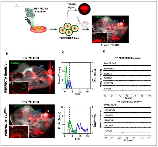 Tumor homing of PERFECTA-ECVs-MSCs. (A) In vivo 19F-MRI of BALB-nu mice bearing HeLa tumor: (B) merged 1 H and 19F-MRI (red) images from mice after the introduction of PERFECTA emulsion (top) and PERFECTA-ECVs-MSCs (bottom). The green circle indicates the tumor site and the blue circles signify the bone marrow (BM) of the spinal cord (solid) and the knee (dotted). The white circle indicates the standard reference (R). In the white box (bottom-left), 19F-MR image magnification targeted on the tumor mass. (C) Histograms of 19F signal-to-noise ratio (SNR) distribution in both tumor and bone marrow of the spinal cord are reported for each mouse. The dashed line identifies the SNR limit above which 19F signal is detectable (SNR > 3). (D) 19F-NMR spectra of harvested organs from a representative mouse among those treated with PERFECTA emulsion and those treated with PERFECTA-ECVsMSCs [] attribution 4.0 International (CC BY 4.0).