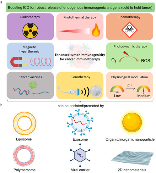 Strategies to enhance tumor immunogenicity. (a) Choices of physical, chemical, or pharmaceutical/physiological approaches to alter the whole tumor immunogenicity to boost cancer immunotherapy (CIT). (b) The therapeutic outcome of these methods can be further promoted by the applications of multifunctional nanomaterials. The image was created by bioRender.com.