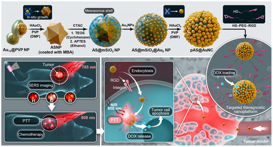 Plasmonic nanoparticles show unique optical properties that make them exciting tools in nanomedicine [57]. These nanoparticles have emerged as one of the most promising ways to achieve multiple tasks, such as optical imaging, targeted chemotherapy, and localized photothermal therapy (PTT) [58,59]. They can be efficient in tumor theranostics and preventing tumor recurrence [60]. Our team has recently reported a NIR-responsive multilayered gold nanoarchitecture with large mesoporosity (436 m2g−1 and 0.8 cm3g−1) to load DOX (loading efficiency = 34.1%) and high PCE (85.5%), and ultrasensitive surface-enhanced Raman spectroscopy (SERS) detection for tumor theranostics (Figure 4) [16]. SERS imaging has several advantages over fluorescence imaging, including its low cost, high photobleaching resistance, unique vibrational spectrum, and low background. With the αvβ3 integrin-binding moiety Arg-Gly-Asp (RGD), this nanoplatform effectively targeted HeLa cell tumor models both in vitro and in vivo. The optimal therapeutic time was determined by the highest SERS signal during receptor-mediated endocytosis. A single 5 min NIR laser illumination (at 0.5 W/cm2) at the SERS-identified tumor site induced robust ablation of the tumor through effective photothermal therapy (PTT) and high apoptosis rates of tumor cells due to efficient doxorubicin (DOX) release. There was no cancer recurrence observed after one month of observation, and minimal side effects were observed. Although the immune response was not studied in this treatment, significant tumor cell death may have caused sufficient ICD-related biomolecules to activate immune memory and suppress recurrence. In summary, NIR-based cancer nanotheranostics is a hot trend that combines deep-tissue imaging and synergistic therapy to achieve an effective therapeutic window for cancer.