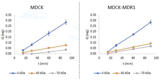 When the same study was repeated, but with combining the MDCK and the MDCK-MDR1 cells with the U87-MG cell line, it was observed that there was a clear increment in the permeation for the fluorescein with the worst access to the CNS when the BBB was intact (the 70 kDa fluorescein) (Figure 2).