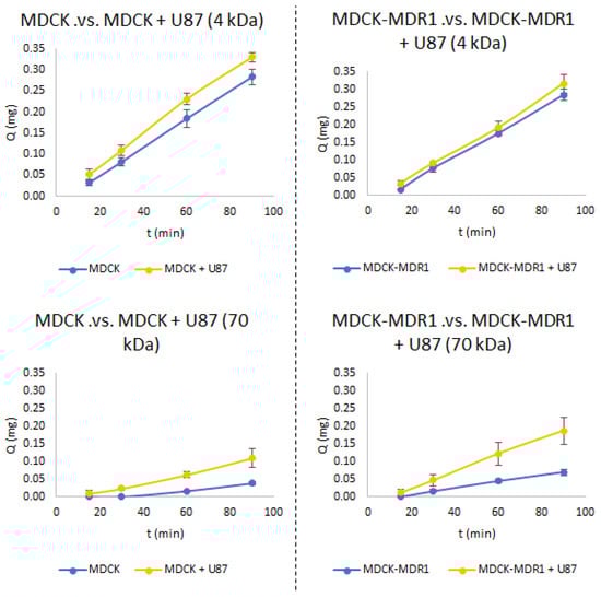 There was an increase of 2.74-fold and 2.72-fold in the permeability value of the 70 kDa fluorescein when the U87-MG cell line was added to the MDCK and MDCK-MDR1 monolayers. This increment was observed by Mendes et al. but also by Dwyer et al. using the 40 kDa fluorescein [,]. The 4 kDa fluorescein was not affected by the presence of the glioblastoma cells because, due to its small size, it had a high permeability even in the healthy models; the ratios obtained for this molecule were 1.17 and 1.06 for each cell line, MDCK and MDCK-MDR1.