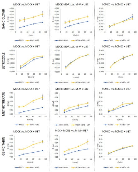 Permeability experiments were carried out on cell monolayers grown on a polycarbonate membrane, 0.4 µm pore size, and with a surface area of 4.2 cm2. For this study, the MDCK, MDCK-MDR1 and hCMEC/D3 cells were seeded (6.5 ×105 cells/cm2) in the apical side of 6-well transwell plates and they were left to grow until confluence. The confluence was reached in approximately 6–8 days. In order to simulate the glioblastoma illness, on the second day after seeding the MDCK, MDCK-MDR1 and hCMEC/D3 cells, the U87-MG cell line was added (7,5·105 cells/cm2) to the basolateral compartment as previously carried out by Mendes et al. []. After a week, the confluence of the monolayers was checked by means of measuring the TEER values of each well. If the resistance was good, the experiments were carried out under agitation and at 37 °C, adding the drug solution in the apical chamber and taking samples from the basolateral chamber after 15, 30, 60 and 90 min. With the aim of reproducing the in vivo conditions, the concentrations of the drugs tested were equivalent to the maximum plasma concentration reported in rats, that is, 50 μM for ganciclovir (46.9 μM—[]), 5 μM for letrozole (3.5 μM—[]), 50 μM for methotrexate (44 μM—[]) and 75 μM for gemcitabine (76 μM—[]). After the last sampling time, cells were washed with HBSS and the TEER value was measured again to test that the membrane was not broken during the experiment due to the drug or the experimental process. After that, the monolayers were disrupted with methanol to recover the drug from inside the cells. Finally, samples were centrifuged and analysed by HPLC or spectrometry.