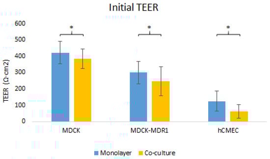 Comparison of the initial TEER values (Ω·cm2) between the monolayers and the co-cultures for each cell line studied. * The differences between the three groups were statistically significant (p < 0.05).