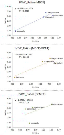 The correlations obtained after representing together the in vitro and the in vivo ratios are represented in Figure 5. From these data, it can be extracted that the simplest cell lines (MDCK and MDCK-MDR1) co-cultured with the U87-MG cells reflected in a more reliable way what happens in vivo than the co-culture with the most complex cell line (hCMEC/D3). The coefficient of determination (r2) for the correlation with the hCMEC/D3 cells was 0.271, while this coefficient for the other cell lines was greater than 0.800.