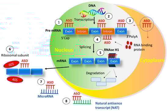 ASOs can be defined as single-stranded nucleic acid polymers (pieces of DNA) that are small (around 18–30 nucleotides), synthetic, composed of diverse chemistries, and complementary to the messenger RNA (mRNA) targets. They are employed for the modulation of gene expression via various mechanisms [4,5]. Upon binding of the DNA-based oligonucleotides to their cognate mRNA transcripts, the DNA-RNA heteroduplex substrates are formed, which further catalyzes the breakdown of RNA. Downregulation of the molecular target is the major goal of the antisense approach, which is often accomplished by inducing RNAse H endonuclease (one component of ASO) activity that recognizes and cleaves the RNA-DNA heteroduplex substrates. Destruction of the target RNA due to cleavage at the site of ASO binding leads to the silencing of target gene expression and diminution of target gene translation. The other potential mechanisms for the activity of ASO include inhibition of 5′ cap formation, modification in the process of splicing (splice-switching), and steric hindrance of ribosomal activity [4,6]. Briefly, ASO binds to mRNA and prevents its ability to make proteins, thus inhibiting translation and obstructing the production of faulty proteins. Functional mechanisms of ASOs are demonstrated in Figure 1. Upon entry into the nucleus, ASO binds to pre-mRNA and inhibits events related to the formation of the 5′ cap, splicing, RNA binding proteins, RNAse H1-mediated target degradation, translation, microRNA, and natural antisense transcripts. Table 1 represents approved ASOs in the clinic.
