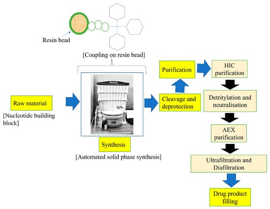 Generally, ASOs are synthesized by solid-phase synthesis, and based on structural modifications, ASOs can be categorized into the following types: first-generation ASO (backbone modified oligonucleotides), second-generation ASO (2′sugar–′modified oligonucleotides), and third-generation ASO (zwitterionic oligonucleotides) [18]. Figure 2 demonstrates the overall synthesis and purification methods for ASOs.