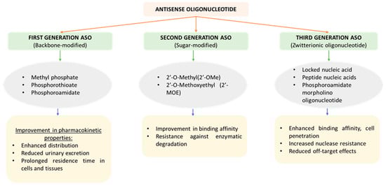 Third-generation ASOs are considered superior in comparison to first- and second-generation ASOs in terms of cell penetration, binding affinity, efficacy, resistance against nucleases, and negligible off-target effects. It involves chemical modification, including nucleobase modifications and bridged nucleic acids [25]. A specific type of nucleic acid known as “locked” nucleic acids is characterized by the presence of a methylene bridge, which connects the 2′ oxygen and 4′ carbon atoms of the ribose ring. The presence of a methylene bridge bond has been found to lock the flexibility of parent sugar, which further enhances the strength of its target interactions [26]. Miravirsen, a third-generation ASO, is one of the first miRNA therapies to be developed and undergo clinical testing. This ASO acts by targeting miR-122 for the management of hepatitis C infection [27]. The properties and chemical characteristics of different generations of ASOs are presented in Figure 3.
