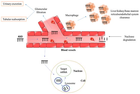 The other major obstacles associated with ASO-based therapies are poor intracellular delivery to the target site because of their inability to cross biological membranes, the potential for “off-target” effects, immunostimulatory activity, and other side effects [34]. The transport of the ASO from the circulation into the interstitium and then into the target cell (nucleus) to reach the target mRNA is required for successful gene silencing following systemic delivery. However, ASO may be degraded in the blood, removed by renal excretion, or taken up by tissue macrophages. Given their potential inability to traverse the vascular wall, ASO may be unable to reach their intended cell targets. ASO may be unable to reach their intracellular target (mRNA) once they have entered the interstitium due to their failure to either pass the cell membrane or escape the endosome-lysosome route [35]. The fate of ASO upon systemic administration is represented in Figure 4.