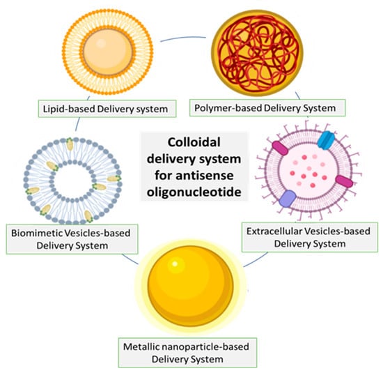 Several colloidal carrier systems have been explored for ASO delivery in various disease conditions, which are demonstrated in Figure 5. For instance, core-shell nanoparticles comprising of α-tocopherol succinate and poly (lactic acid)-g-poly (ethylene glycol) have been extensively researched for ASO delivery in lung cancer [51]. MALAT1-specific ASO and TAT peptide co-functionalized gold nanoparticles, namely ASO-Au-TAT NPs, that are capable of targeting the nucleus, were developed by Gong et al. The prepared nanoparticles imparted stability to ASO, exhibited improved internalization into the nucleus, and demonstrated good biocompatibility [52]. Yang et al. explored exosome-mediated delivery of ASO, which is capable of targeting alpha-synuclein for ameliorating the pathophysiology in a mouse model of Parkinson’s disease [53]. Biomimetic vesicles such as apoptotic bodies derived from tumor cells have also been explored for delivering ASO across the blood-brain barrier [54].
