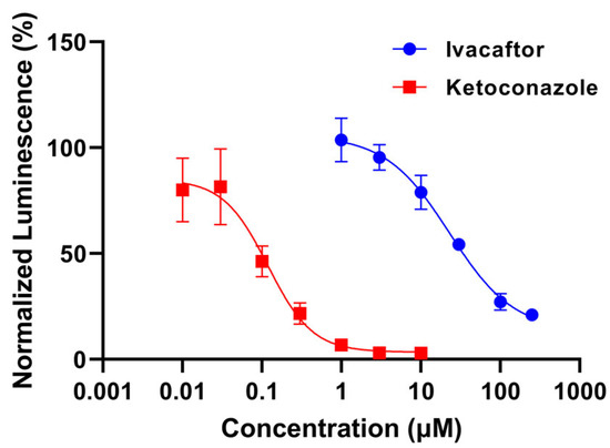 In vitro CYP3A4 inhibition by ivacaftor and ketoconazole at n = 3 per concentration. Both compounds demonstrated concentration-dependent inhibition of CYP3A4. Luminescence signal was normalized by dividing the luminescence of compound-treated well by the mean luminescence of DMSO-treated control wells and multiplying by 100.