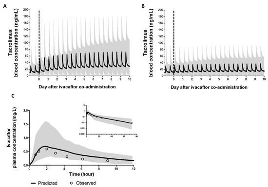 Blood concentration profile of tacrolimus and plasma concentration profile of ivacaftor, with the grey-colored area showing the range of predicted concentrations from 5th to 95th percentiles. (A) Continuing the same tacrolimus dose when ivacaftor was co-administered. (B) A 50% reduced tacrolimus dose when ivacaftor was co-administered. (C) Concentration profile of ivacaftor single dose (100 mg) administered.