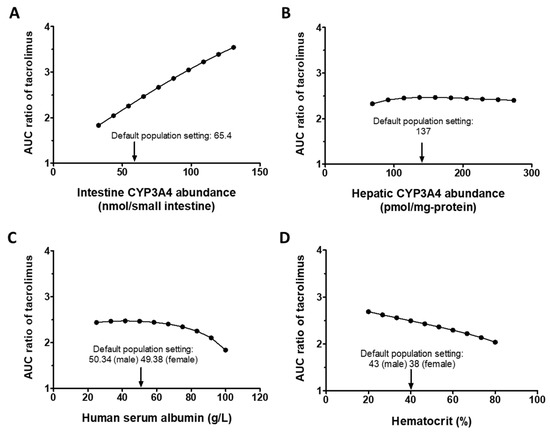 CF patients have been found to exhibit a reduced serum albumin level by 15% when compared to healthy individuals [54]. Further, in lung transplant recipients, it has been reported that hematocrit levels may decrease to as low as 20% [55,56,57]. It should be noted that the incidence of anemia decreases over time after a transplant, with 52% of patients having anemia, with the majority of cases being mild after 3 years post-transplant, in contrast to the initial post-transplant period, where 98.2% of the population has anemia [57]. Therefore, these parameters were also included in the sensitivity analyses. While low albumin levels did not significantly affect DDI, low hematocrit levels led to higher DDI (AUC ratio of 2.69 at 20% of hematocrit), suggesting that more close monitoring may be required in this case due to the increased risk of elevated tacrolimus exposure. The sensitivity analysis provides mechanistic insights into factors contributing to the variability in tacrolimus DDI. More, this analysis can bridge the gap between the virtual and actual patient populations, thereby improving the predictability of a PBPK simulation.