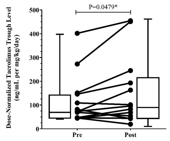 Differences in tacrolimus trough concentrations before versus after starting ETI were analyzed utilizing the Wilcoxon signed-rank test, using all patients with both pre- and post-ETI measurements, against the null hypothesis that the difference in tacrolimus trough concentrations would be zero or demonstrate no change. All statistical analyses were performed using GraphPad version 8.0.2, with a two-sided significance value of 0.05.