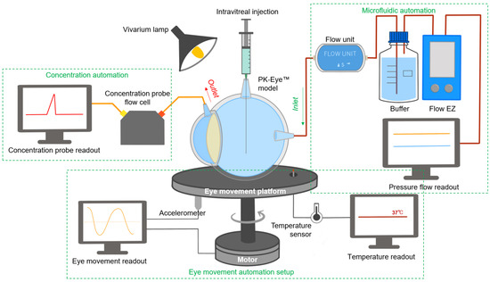 Schematic of the real-time monitoring platform of the PK-Eye™ model. The platform setup included a microfluidic automation system for flow analysis, an eye movement automation platform for investigating the effects of eye movement and a concentration automation setup (with the use of probes) for clearance estimation of labelled proteins. All these setups were used in parallel to provide constant monitoring of different parameters in ophthalmic drug delivery and development.