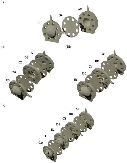 (i) First-generation PK-Eye™ model, (ii) posterior inflow model, (iii) ciliary inflow model and (iv) RCS model. A0: First generation PK-Eye™ anterior part outlet, A1: anterior part outlet (front of the model sampling), B0: iris part, C0: lens part, C1: lens part with aqueous humour inlet, D0: hyaloid membrane, E0: posterior part with aqueous humour inlet (inflow) and injection port (drug administration), E1: posterior part with injection port, E2: posterior part for RCS model with injection port (drug administration), F0: RCS membrane and G0: RCS outlet (back of the model sampling).
