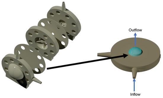 The hyaloid membrane (Figure 3) is made of a Visking material, which created a partition between the anterior and posterior cavities to separate the content of the posterior cavity from the anterior cavity [36]. The Visking membrane is a polymeric membrane and was used to filter drugs between the two cavities to create a flow resistance that pressurised the model within physiological parameters (between 10 and 20 mmHg) [37]. Polymer membranes have found numerous uses in a number of industries, including pharmaceutical industry applications for drug delivery and filtration [38,39,40]. Their diverse properties, including hydrophilicity/hydrophobicity, biocompatibility and permeability, make them uniquely suitable for these applications. This design concept of partitioning the two cavities was first demonstrated with the first generation PK-Eye™ model [22], which was eventually used to design the follow-up prototype, called the posterior inflow model [25].