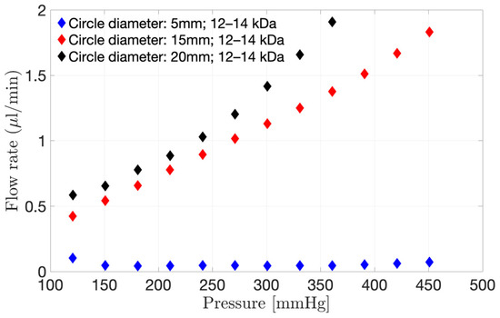 Interstitial flow rate through the 12–14 kDa membrane when using the pursing model for a range of pressure varying from 0 to 451 mmHg. Three different surface areas were investigated, i.e., 5.0, 15.0 and 20.0 mm diameter circles.