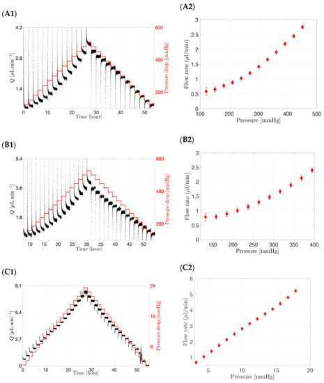 The interstitial flow rates through different membranes (12–14 kDa to 300 kDa) and a fixed surface area (20.0 mm diameter) using a range of pressures are shown in Figure 5. In the left panel, both the flow rate and pressure drop were plotted over a period of 50 to 60 h, while in the right panel the flow rate versus the pressure obtained from the left panel are shown with their standard deviations. The pressure was first increased in a stepwise manner and then decreased in a stepwise manner to minimise any hysteresis effects. The graphs (Figure 5A1,B1,C1) showed a direct incremental relationship between the pressure drop (in red) and the flow rate (in black) in the model, irrespective of membrane pore size.