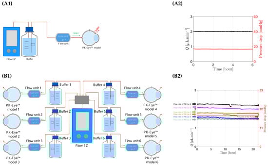 (A1,A2) Schematic representation of flow rate control using first generation PK-Eye™ models in PBS at room temperature (RT, ~20–22°C) with a pressure control of approximately 20 mmHg for 6 h. (B1,B2) Schematic representation of pressure control with a 1:6 ratios using first generation PK-Eye™ models in PBS at RT (~20–22°C) with a pressure control of 18 mmHg for 24 h.