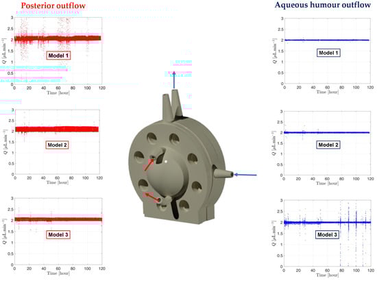 RCS models were assembled with a fresh batch of SVF, and pressure was monitored for 5 days (Figure 9). The aqueous humour outflow (right panel, Figure 9) is shown in blue with the blue arrows on the model indicating the direction of the flow. A second flow at 2.0 µL/min (left panel, Figure 9) was also established in the back of the model, shown in red, with red arrows indicating the flow direction through the model. The flow did not enter the posterior cavity and simply flowed along the posterior side of the RCS membrane akin to the RCS blood flow to collect the drug and carry it into the reservoir for drug characterisation. It can be noticed that the flow rate data remained constant at 2.0 µL/min and stable for the duration of the testing period, with only minor fluctuations in flow rate (slight deviations from the flow rate baseline of 2.0 µL/min). This indicated no issues with SVF leakage from the model and emphasised the general robustness of the microfluidic system and model setup across the entire duration of the experiment.