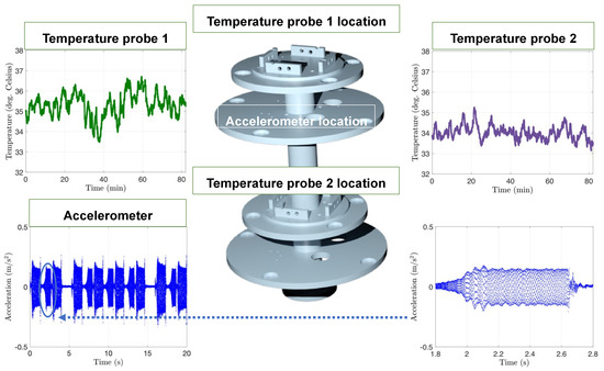 Temperature sensors and accelerometers were acquired and integrated with the in-house eye movement platform. These different components were supplied by different manufacturers and were integrated into a unique platform from NI to help with data collection and synchronisation. The platform acquired and generated multiple signals simultaneously with frequencies in the Megahertz range. The cRIO-9048 acted as a computer working on a Linux Real System enabling a high data transfer rate, which is multiple times higher than traditional computers. The cRIO-9048 accommodated eight different cards to acquire specific signals, i.e., for the accelerometers, the temperature probes, the rotary motor and a card to generate Transistor-Transistor Logic (TTL) signals for future integration. Preliminary work focused on understanding the compatibility of each card with each sensor as well as eventual hardware connections and programming.