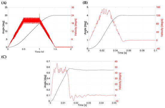 Here, the real position and velocity of the key motion were further assessed (Figure 12). The position in degrees and the velocity (°/s) for the smooth pursuit are shown in Figure 12A. The velocity of the PK-Eye™ model is shown in red, while the angle is shown in black. The data recording was done at 2000 Hz. The PK-Eye™ model covered 20°/1.5 s with a peak velocity at 25.18°/s. The smooth pursuit saccades movement is shown in Figure 12B (recorded at a rate of 2847 Hz), where a saccadic motion of 4°/50 ms with a peak velocity of 153.8°/s was computed. The micro-saccades movement is shown in Figure 12C, and had a displacement of 0.55°/14 ms with a peak velocity of 52.5°/s. These results, for the first time, demonstrate the programming of the eye movement in more detail (Table 2) to evaluate and assess the real-time monitoring of eye movements, which can further be used to evaluate in vitro properties of other drug molecules and formulations of interest.
