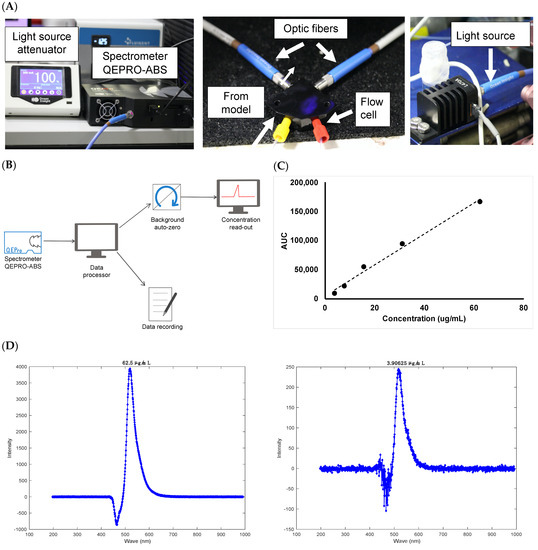 The setup for the concentration probe is shown in Figure 13A with a schematic of the program used in Figure 13B. Combined without the need for manual sampling, the spectrometer demonstrated more data points, better stability and resolution at normal light levels as compared to other manual UV detection methods. Initial work focused on setting up the equipment and synchronising the system with the microfluidic setup. Significant troubleshooting was conducted to allow seamless real-time data collection and to avoid system crashing during the run. PBS, pH 7.4 was then injected into the flow cell of the concentration probe at 470 nm, which was taken as the “background” reading to zero the signal. Since extensive work on clearance studies in the model has been previously demonstrated (and compared to in vivo values) and referenced in this manuscript, Alexa albumin was chosen here as a molecule simply to demonstrate proof-of-concept of the concentration monitoring platform due to its higher extinction coefficient compared to unlabelled proteins. It was difficult to assess the concentration of unlabelled protein (e.g., ranibizumab and bevacizumab) with the concentration probe due to the sensitivity limit of the setup. As a result, Alexa albumin was chosen to demonstrate this novel setup with the in vitro model and was injected into the flow cell of the concentration probe at 470 nm. The AUC was calculated from the labelled protein signal obtained for each analysed concentration. The calibration curve generated good linearity with an R2 value of 0.9942 (Figure 13C). The plot was prepared using a stock solution of Alexa albumin (250 μg/mL) in PBS, pH 7.4 followed by serial dilutions (3.9–62.5 μg/mL, Figure 13D) that were quantified by the setup at 470 nm with a direct injection into the flow cell.