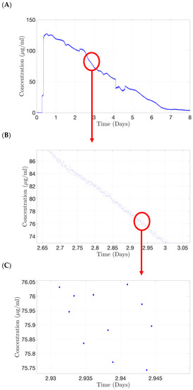 A preliminary experiment was conducted using a first-generation PK-Eye™ model, which was assembled without a membrane, with both cavities filled with PBS, pH 7.4. Alexa albumin (5.0 mg/mL, 100 µL) was injected in the posterior cavity of the model and the outlet port was connected to the flow cell of the concentration probe for real-time readout and allowed to run for 8 days (where protein concentrations were quite negligible) at a rate of 1 reading/minute (Figure 14). A typical drug release profile of the labelled protein (Alexa albumin) is shown in Figure 14A. A close-up of this profile from 2.65 to 3 days (Figure 14B) demonstrated the smooth decrease in drug concentration, indicating that the concentration probe was able to maintain a stable readout of the fluid passing through the flow cell. A further close-up from 2.93 to 2.95 days (Figure 14C) showed that the variation of drug concentration detected by the probe is less than 0.3 µg/mL between each time point.