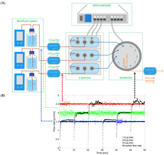 In a first experiment to demonstrate the capability of the setup, three inlet flow rates were set at 1.5, 2.0 and 2.5 µL/min flowing into three 2-SWITCH components that were connected to the M-SWITCH. The program was written to toggle the 2-SWITCH and M-SWITCH every 10 min to switch among three flows for 1 h. The rate of the M-SWITCH outflow was recorded via the flow unit connected to the outlet of the M-SWITCH. The flow rates of all flow units were recorded and analysed by MATLAB.