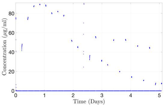 The concentration-time profile for Alexa albumin injected into the PK-Eye™ (posterior inflow model) was also determined with the concentration probe setup. The posterior inflow model was selected by the ESS™ platform to automatically run through the concentration probe for 20 min every 4 h 40 min. When not selected, the content from the posterior inflow model cleared into the waste reservoir, and PBS, pH 7.4 flowed through the concentration probe to avoid drug accumulation during the experiment. A toggling program was selected between the PK-Eye™ model and the PBS reservoir. The concentration probe was able to reproduce the drug release curve with a maximum concentration of approximately 89.0 µg/mL cleared from the model at 20 h (Figure 16). The gaps between points correspond to the 280-min interval when the drug was clearing into waste and not through the concentration probe, as a result of the toggling program. However, some points were out of range showing that, when handling concurrent multiple outlets through a single concentration probe, great care needs to be taken to ensure the probe is able to detect the right amount of drug. This demonstrates the automatic selection of channels flowing through the concentration probe, i.e., the posterior inflow model and a PBS channel. The program automatically selected the posterior inflow model and data were plotted (Figure 16). When not selected, the model did not stop flowing and the flow was automatically redirected to a waste reservoir. This set of data shows the potential for automatically redirecting different flows from the models via a concentration probe setup to remove any manual handling in order to record the concentration of cleared drug, and further illustrates the real-time monitoring capabilities of the platform.