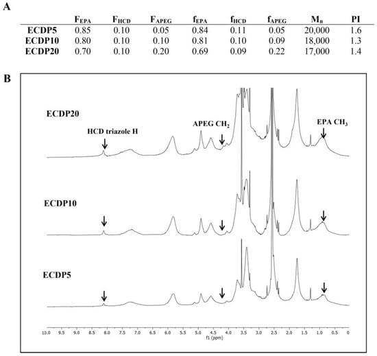 - Spectroscopic techniques: Polymer systems were characterized via 1H nuclear magnetic resonance spectroscopy (1H-NMR). Spectra were recorded in 5% deuterated chloroform (CDCl3) solution, deuterated methanol (CD3OD), or deuterated DMSO (DMSO-d6) with a Varian XLR-300 spectrometer using trimethylsilane (TMS) as the internal standard.
