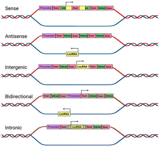 Classification of lncRNAs. LncRNAs are categorized based on their gene location, in relation to protein-coding genes. LncRNAs are classified into sense lncRNAs (contain exons from protein-coding genes), antisense lncRNAs (transcribed from the opposite strand of protein-coding or non-coding genes), intergenic lncRNAs (do not overlap with any protein-coding gene), bidirectional lncRNAs (transcribed from the opposite direction of a protein-coding gene with same promoter), and intronic lncRNAs (transcribed from protein-coding genes of the introns).