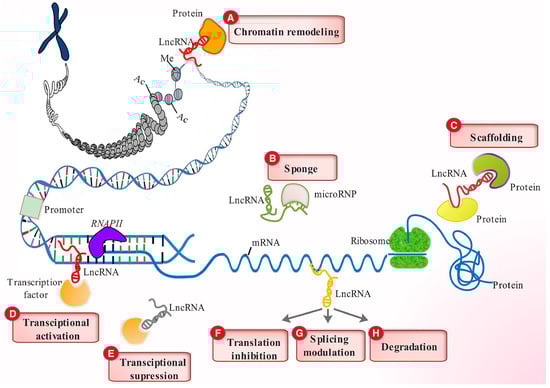 - Statello, L.; Guo, C.-J.; Chen, L.-L.; Huarte, M. Gene regulation by long non-coding RNAs and its biological functions. Nat. Rev. Mol. Cell Biol. 2021, 22, 96–118. [Google Scholar] [CrossRef]