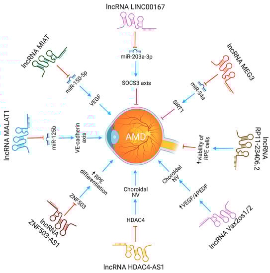 The functions and biological pathways of lncRNAs in age-related macular degeneration (AMD). Blue arrows represent upregulation or activation, while red inhibitory signs represent downregulation or inhibition.