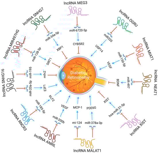 The functions and biological pathways of lncRNAs in diabetic retinopathy. Blue arrows represent upregulation or activation, while red inhibitory signs represent downregulation or inhibition.