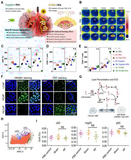 Example of nanomedicine-based RFA to activate immune responses. (A) Schematic illustration of double therapy with cisplatin and RFA and triple therapy (ablation–chemo–embolization) with Pt-PNA nanogels and RFA. (B) Infrared thermal images of the liver treated with local injection of blank control (NS), PNA, cisplatin, or Pt-PNA in combination with RFA (100 W, up to 4.0 min). (C–E) HSP70 expression levels (C), infiltrating CD8+ T cells (D), and infiltrating CD4+ T-cells (E) in residual tumor tissues surrounding the tumor necrosis zone after treatment for a specific number of days (* p < 0.05; ** p < 0.01; *** p < 0.001). (F) 4T1 cells incubated with HCaP, LCaP, or HLCaP nanoreactors in the presence of cancer cell lysates were stained with HMGB1 and CRT antibodies, respectively. Confocal fluorescence images are shown. (G) Schematic illustration of HLCaP nanoreactor-mediated propagation of lipid peroxidation in the presence of cell lysates and subsequent induction of immunogenic cell death. (H,I) RF treatment increases antigen uptake and the maturation of DCs in dLNs in murine models of intradermal vaccination.